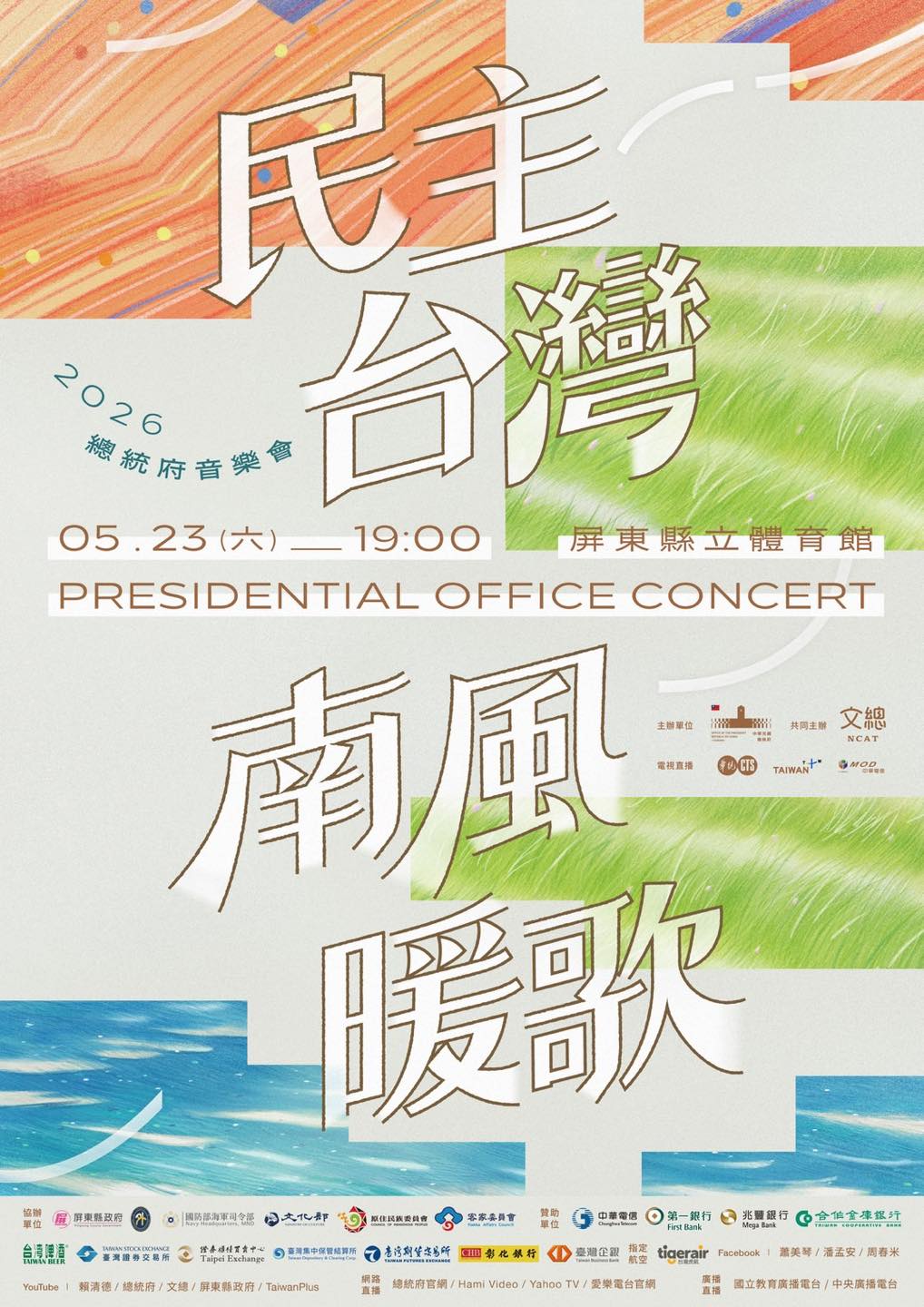 2026總統府音樂會將在5月23日於屏東縣立體育館舉行,主題是「民主台灣 南風暖歌」。這場音樂會適逢總統直選30週年,主辦單位規劃以五大主軸串連人民、土地和時代記憶,透過音樂與舞台呈現台灣不同世代的生活感受與文化故事。