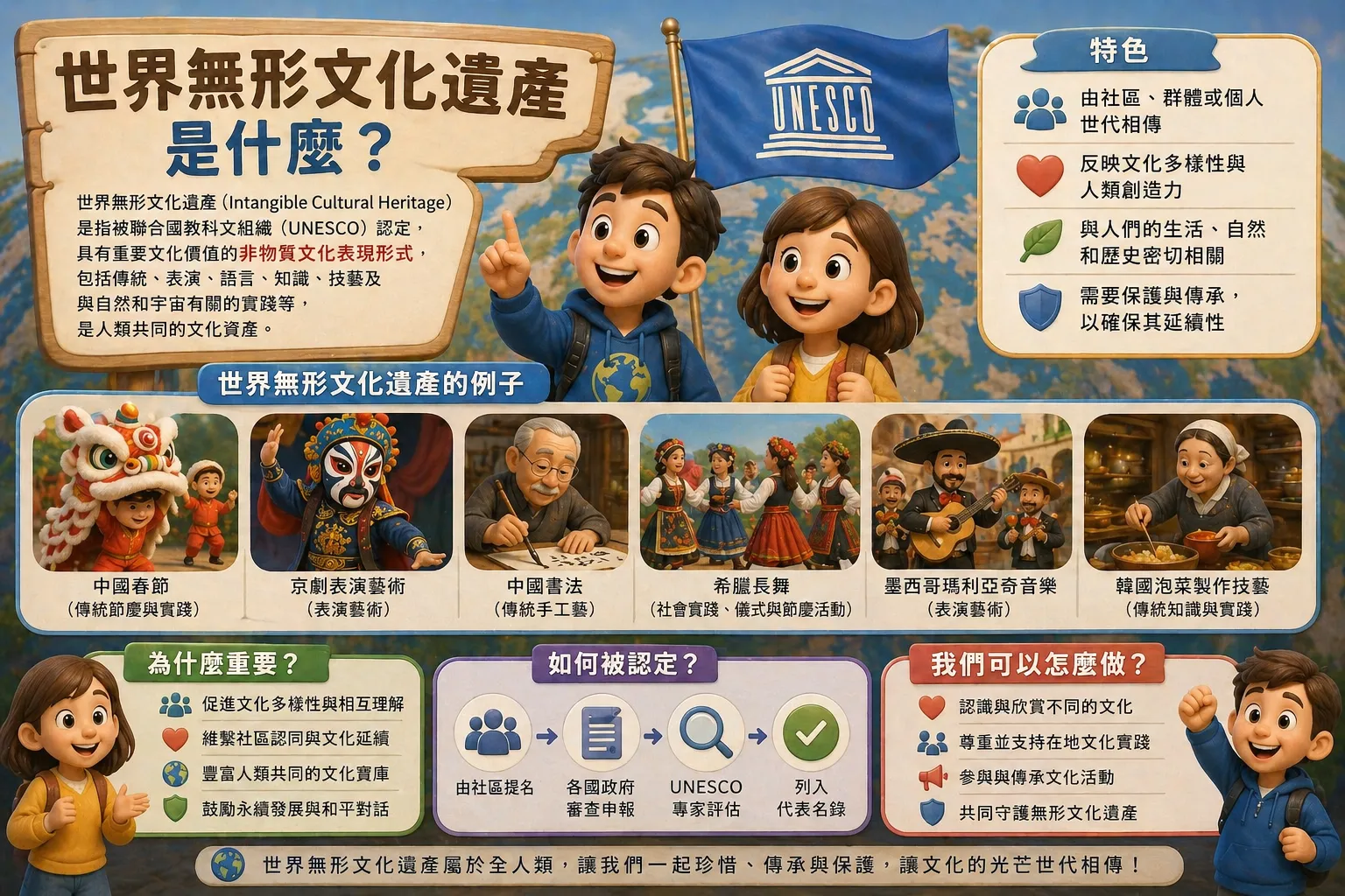 你聽過「世界無形文化遺產」嗎?這個名詞看起來有點難,其實可以先拆成兩部分理解:「文化」是人們長久累積的生活智慧,「無形」是看不見、摸不到單一實體。也就是說,無形文化遺產不是一棟古老建築,而是像技藝、節慶、表演、口述故事、傳統知識這類「靠人傳下去」的文化。簡單說:如果文化像一間房子,「有形文化」是房子本身,「無形文化」則是住在裡面的生活方式與故事。