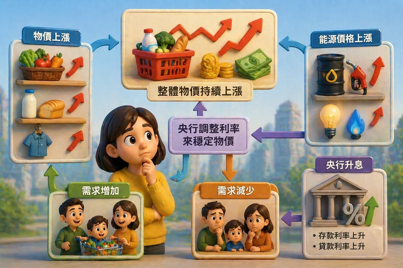 用生活比喻來說,通膨像學校園遊會裡,攤位的食材和運送費都變貴,老闆就可能把一份點心從30元調到35元。如果很多攤位都這樣,大家就會感覺「同樣的零用錢買不到以前那麼多」。這就是購買力下降的意思。